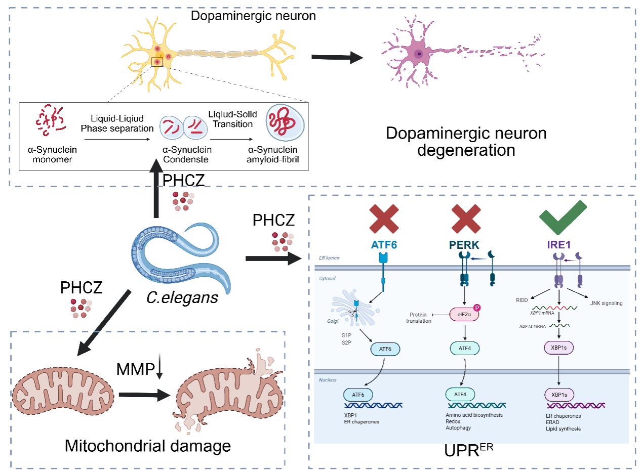 卤代咔唑是一类来源于自然和人工合成过程的持久性有机污染物,具有高稳定性和生物富集性,但其神经毒性机制仍缺乏深入认识。本研究以模式生物秀丽隐杆线虫为对象,系统评估了卤代咔唑的整体毒性和神经毒性。结果显示,卤代咔唑暴露可显著诱导多巴胺能神经元退化,并引起个体发育迟缓及雄性生殖细胞受损。机制研究表明,卤代咔唑能够促进帕金森病相关蛋白α-突触核蛋白发生液-液相分离,并降低其形成凝聚体的流动性,从而加剧其向淀粉样原纤维转化,损伤多巴胺能神经元。进一步研究发现,卤代咔唑暴露可特异性激活IRE-1信号轴介导的内质网未折叠蛋白反应同时损伤线粒体功能,加剧神经退行性病变。本研究首次揭示了多卤代咔唑通过干扰蛋白质液液相分离及内质网应激途径诱导神经毒性的分子机制,为认识新型环境污染物的神经健康风险提供了新的科学依据。