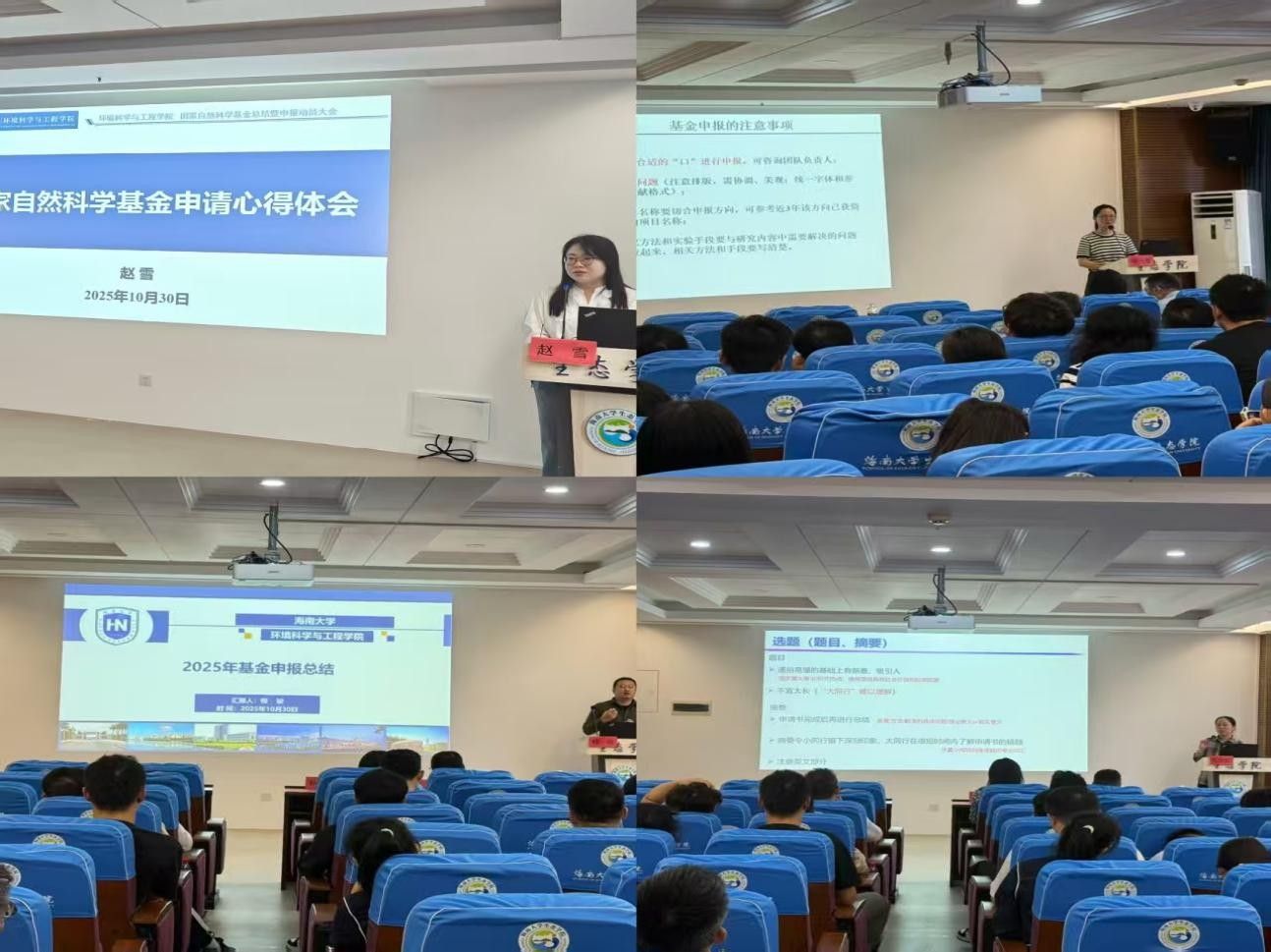 会上,赵雪、张书莹、程骏、孙棐斐等四位申请人作经验分享。赵雪聚焦面上项目,结合自身经历,从项目定位、选题思路、申请书撰写技巧、前期准备工作、研究方向凝练等方面分享实践经验,为相关申报者提供针对性参考;张书莹、程骏、孙棐斐分别围绕青年科学基金项目(C类)和地区基金项目展开分享,重点解析选题逻辑与创新性论证方法,深入讲解申请书呈现等细节。分享内容兼具理论深度与实践指导性,有效助力参会教师提升申报能力。