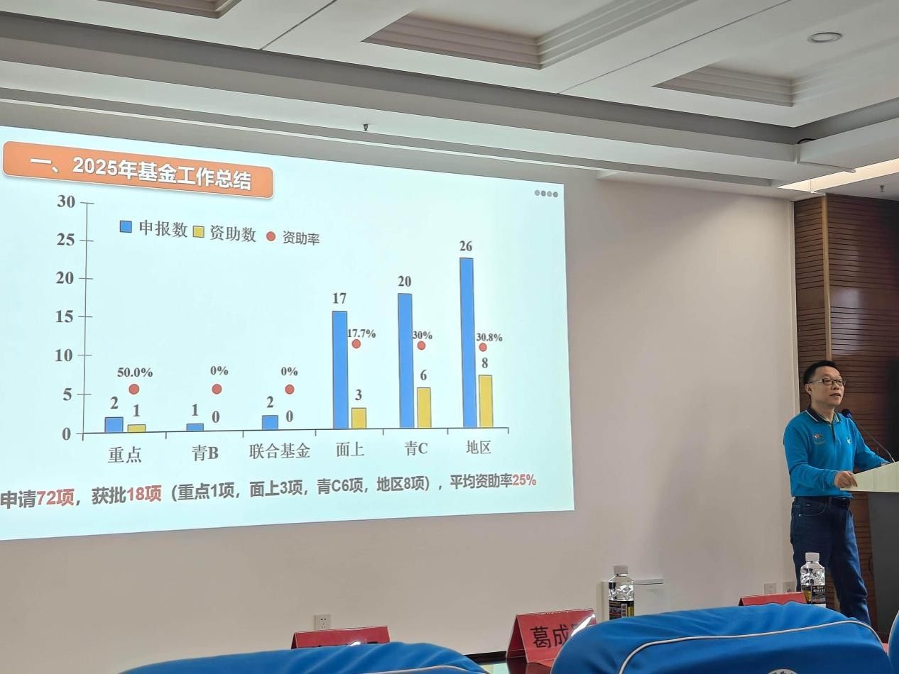 朱治强介绍了公司和公司的基金获批情况,通过复盘2025年的基金申报工作,重点从项目申报及获批的所属学部、项目类型、项目评审意见问题及其改进建议等几个方面,总结申报中的问题点,并针对性地提出2026年的工作计划,将从一对一辅导、团队研讨、传帮带等多个层面,指导老师们的基金申请书写作和打磨。