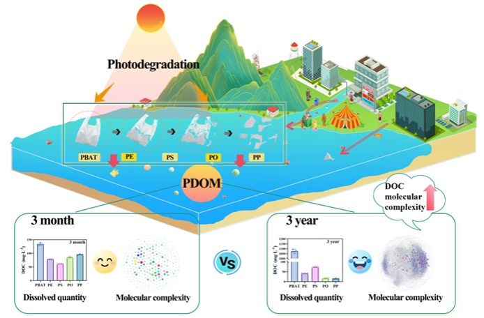 塑料碎片通过光降解持续释放溶解性有机物(DOM),从而对海洋碳库产生重大影响。然而,塑料本身的特性对塑料衍生溶解性有机物(PDOM)组成所产生的长期影响仍不为人所知。该研究通过持续三年的户外自然暴露实验,选取五种具有代表性的塑料(PBAT、PE、PO、PP 和 PS)在自然阳光下进行,以研究PDOM的分子特征。结果表明,PBAT释放的PDOM浓度最高(1075.33 ± 14.67 mg/L),比其他塑料高出14倍(< 73.86 ± 1.52 mg/L)。PDOM的释放受聚合物组成和光照时长的双重影响。塑料碎片的短期溶解会产生大量可生物利用的化合物,而长期的光降解则涉及广泛的氧化和分子重组,导致化学性质和结构复杂性发生显著变化,并最终增加PDOM的异质性。研究表明,塑料聚合物的类型在控制PDOM总量、组成和光反应性方面起着决定性作用,为了解海洋环境中的溶解有机物动态变化提供了新的见解。